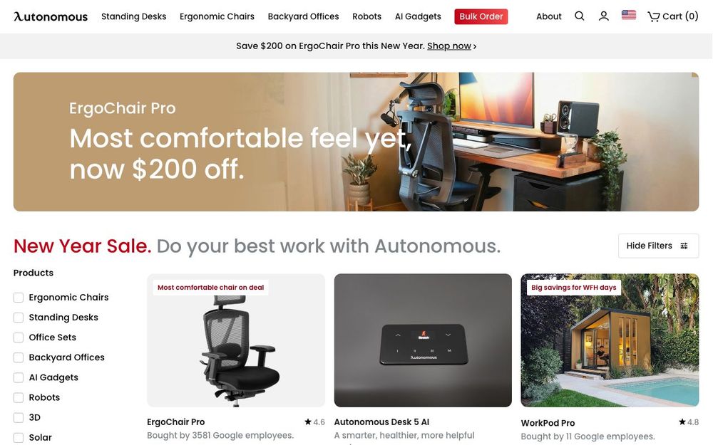 Autonomous.ai is a company that specializes in creating and providing ergonomic office furniture and smart office solutions. Their products range from standing desks and ergonomic chairs to office accessories, all designed with the goal of improving posture, comfort, and overall productivity in the workplace. They leverage technology and design to create a workspace that adapts to the user's needs, promoting a healthier and more efficient work environment.